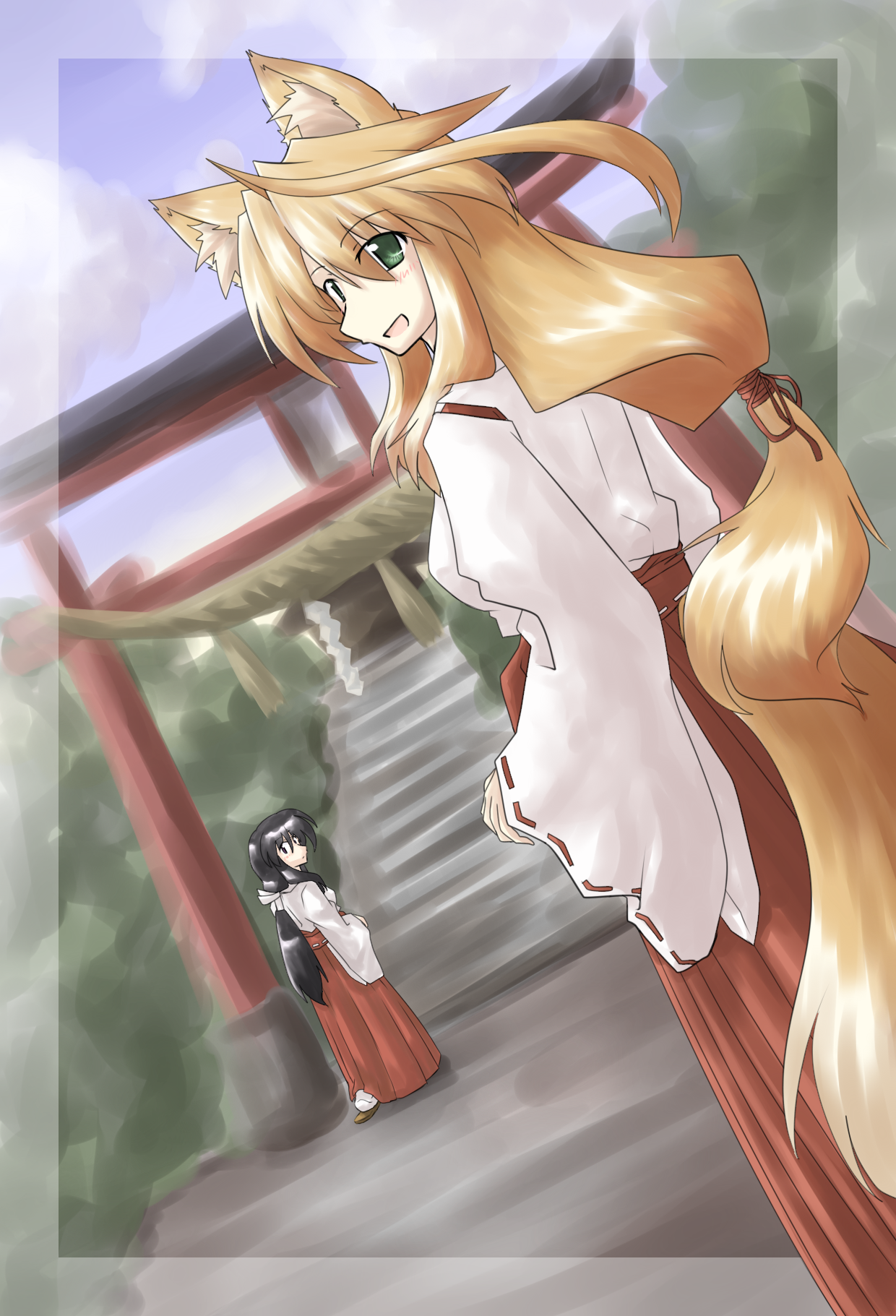 毎度おなじみの狐巫女さんと普通の巫女さんを描いてみました。