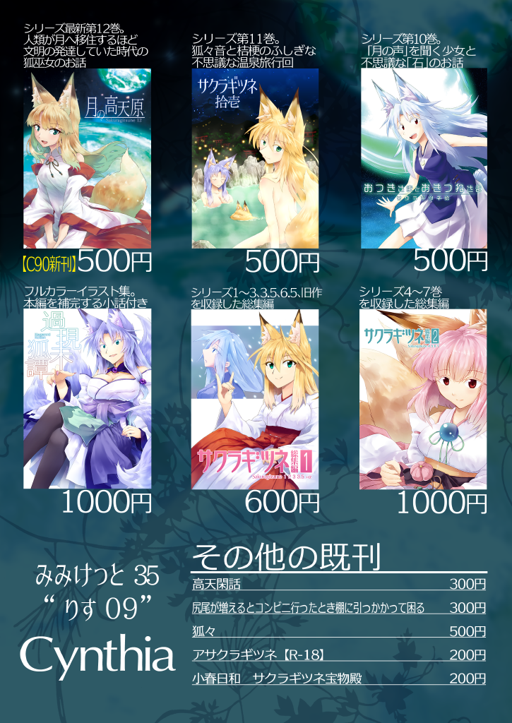 【りす09「Cynthia」】にて参加します。今回はイベント向けの新刊・新作はなさそうなので基本的には先月のコミティアでの頒布物と同様の内容になる予定です。